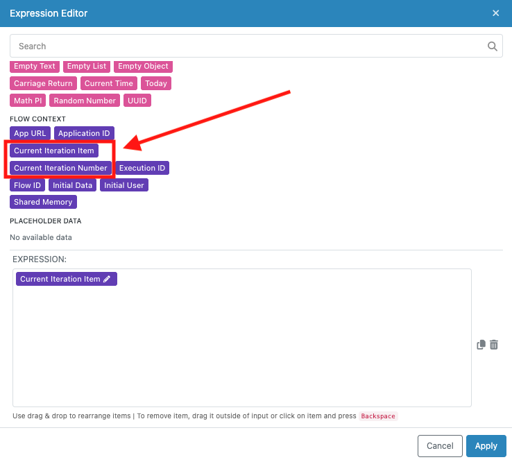 When designing logic inside a List Iterator, the Expression Editor provides access to special context elements that are specific to the current iteration and essential for most iterator implementations.