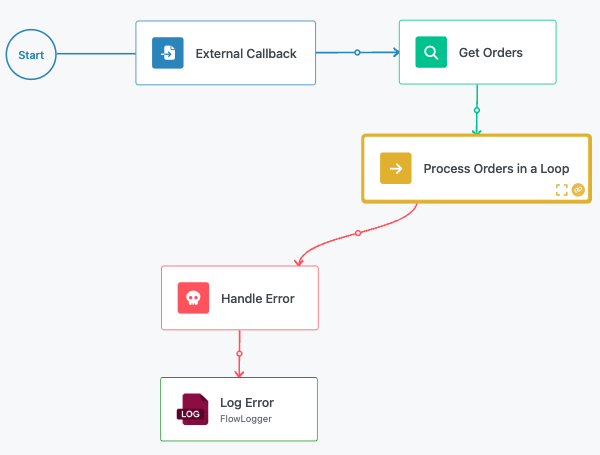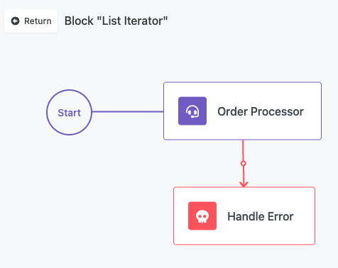 Errors that occur within the List Iterator's internal logic are propagated to the main workflow level. You can connect the List Iterator block to a Handle Error block to manage these exceptions at the workflow level.