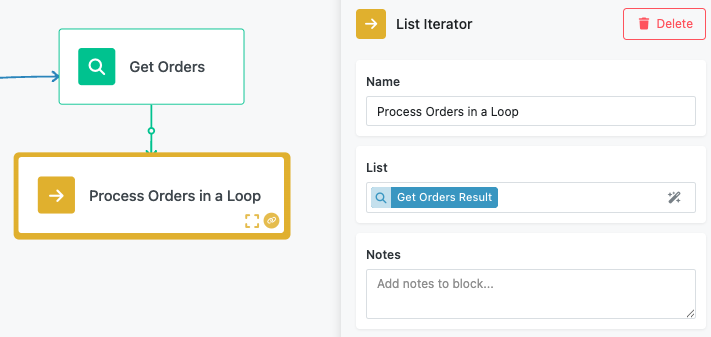 The List Iterator block enables your workflow to process collections of data by executing a sequence of operations for each item in a list. This block functions as a loop mechanism, allowing you to apply the same logic repeatedly to every element in an array or collection, making it essential for bulk data processing, batch operations, and repetitive tasks.